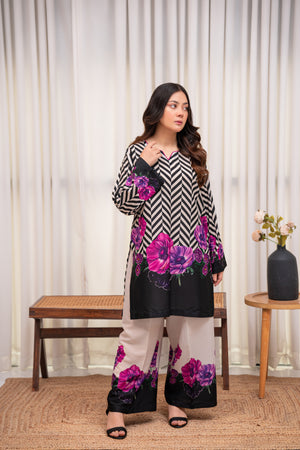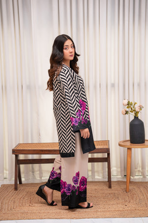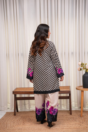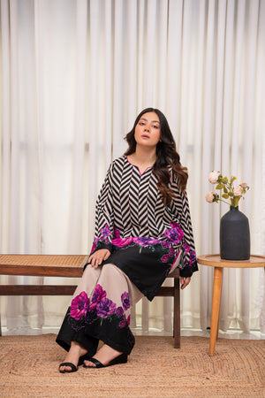 A striking fusion of monochrome chevron and vibrant purple florals, this stitched 2-piece crepe set exudes modern elegance. The ultra-soft fabric ensures effortless grace, making it a perfect blend of bold and beautiful.