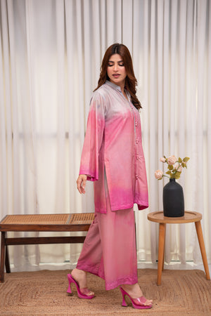 Embrace dreamy elegance with this pink and white ombré crepe ensemble, featuring delicate fabric buttons for a refined touch. The lightweight, breathable fabric ensures effortless style and all-day comfort.