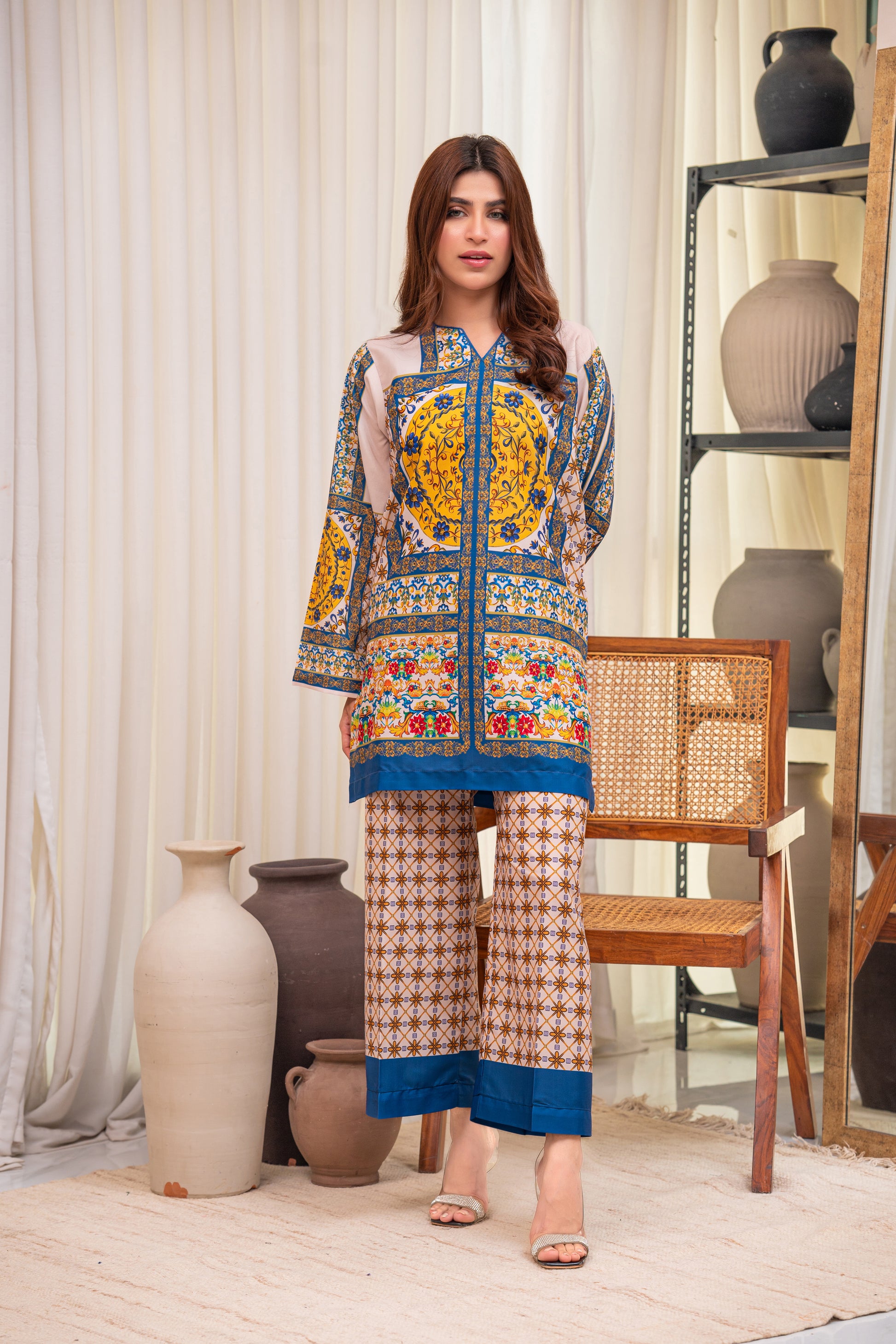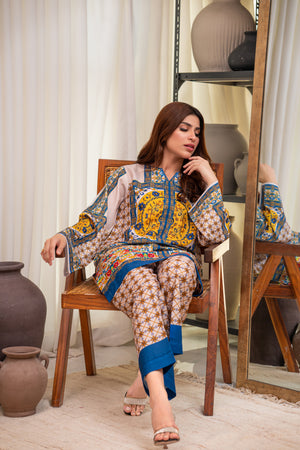 Exude elegance in this 2-piece crepe ensemble featuring baroque-inspired patterns in golden yellow and deep blue. With delicate floral details and geometric mosaic print trousers, it’s perfect for both daytime gatherings and evening soirees