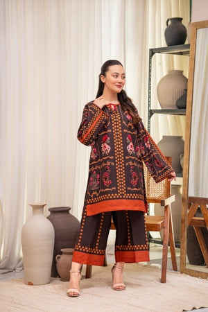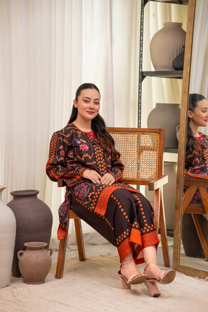 Embrace earthy elegance with this chocolate brown crepe two-piece, adorned with delicate floral motifs and warm rust accents. A perfect blend of comfort and sophistication for any season.