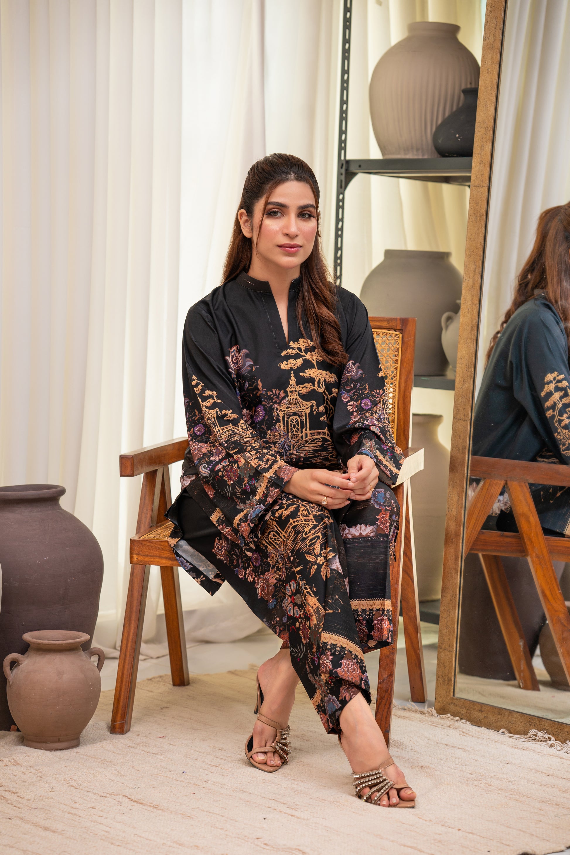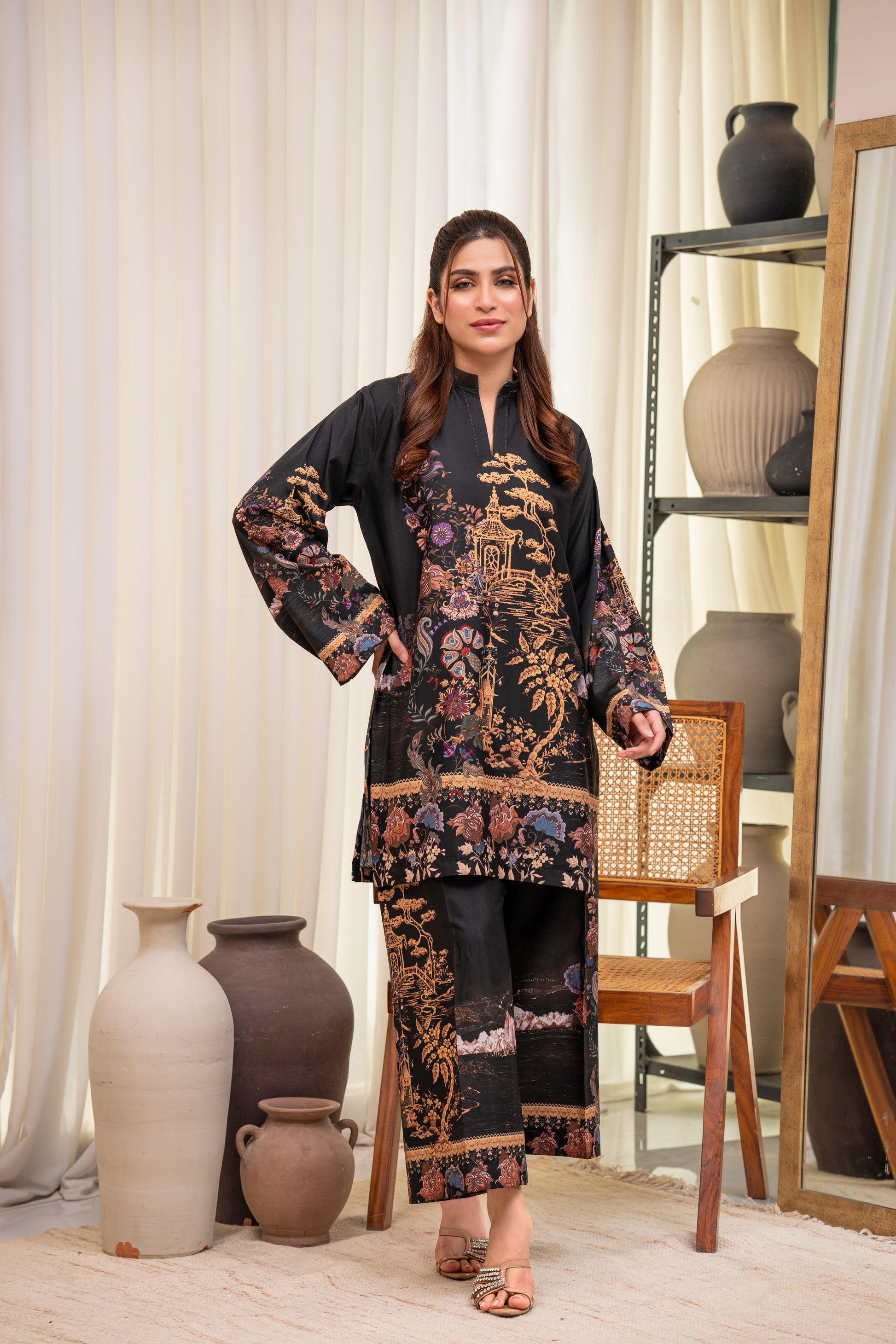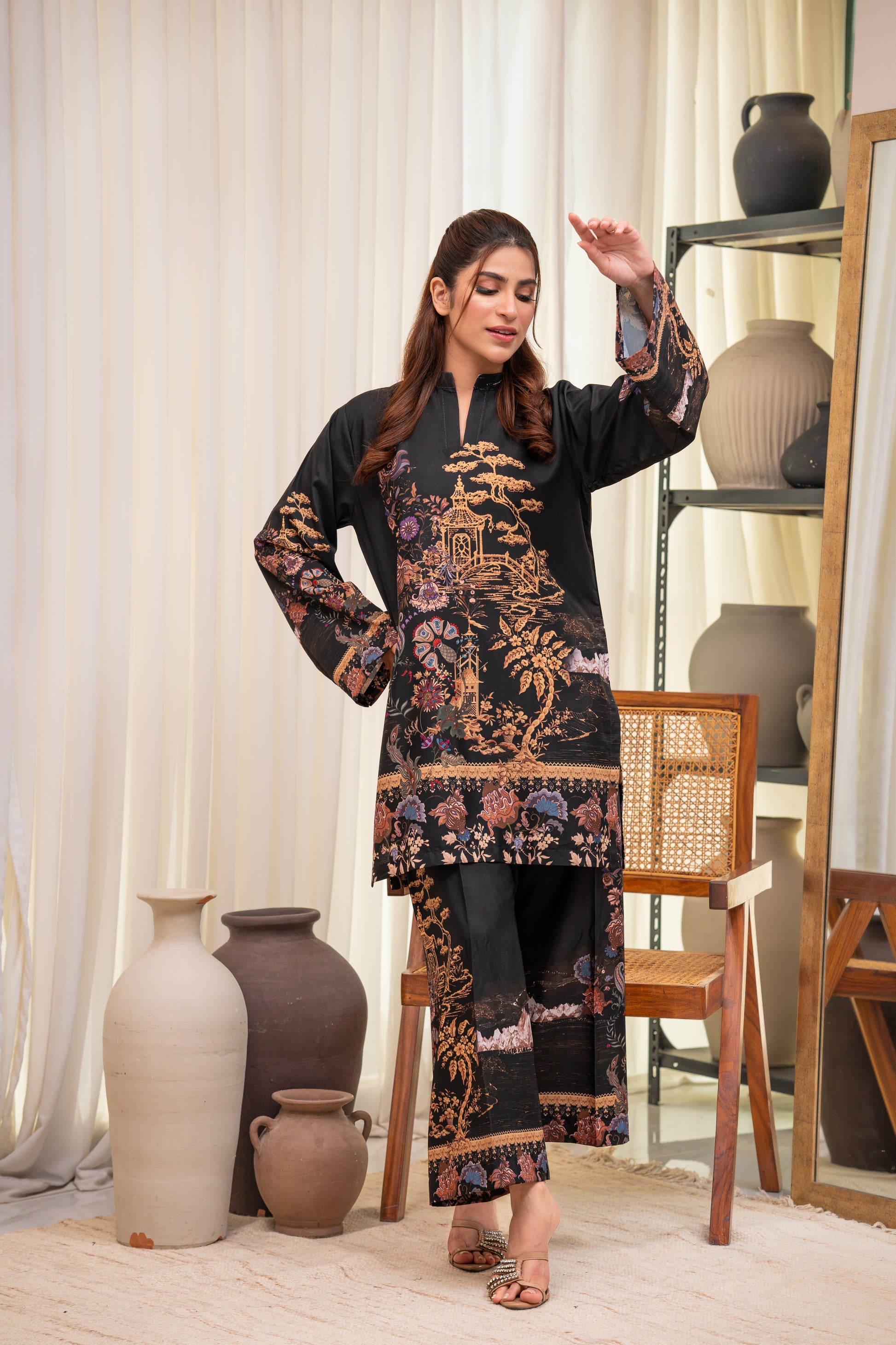 A luxurious black crepe two-piece adorned with intricate gold and floral patterns, evoking timeless charm. Effortlessly chic and breathable, perfect for a sophisticated statement look.