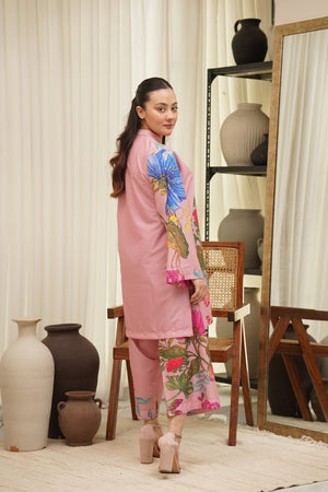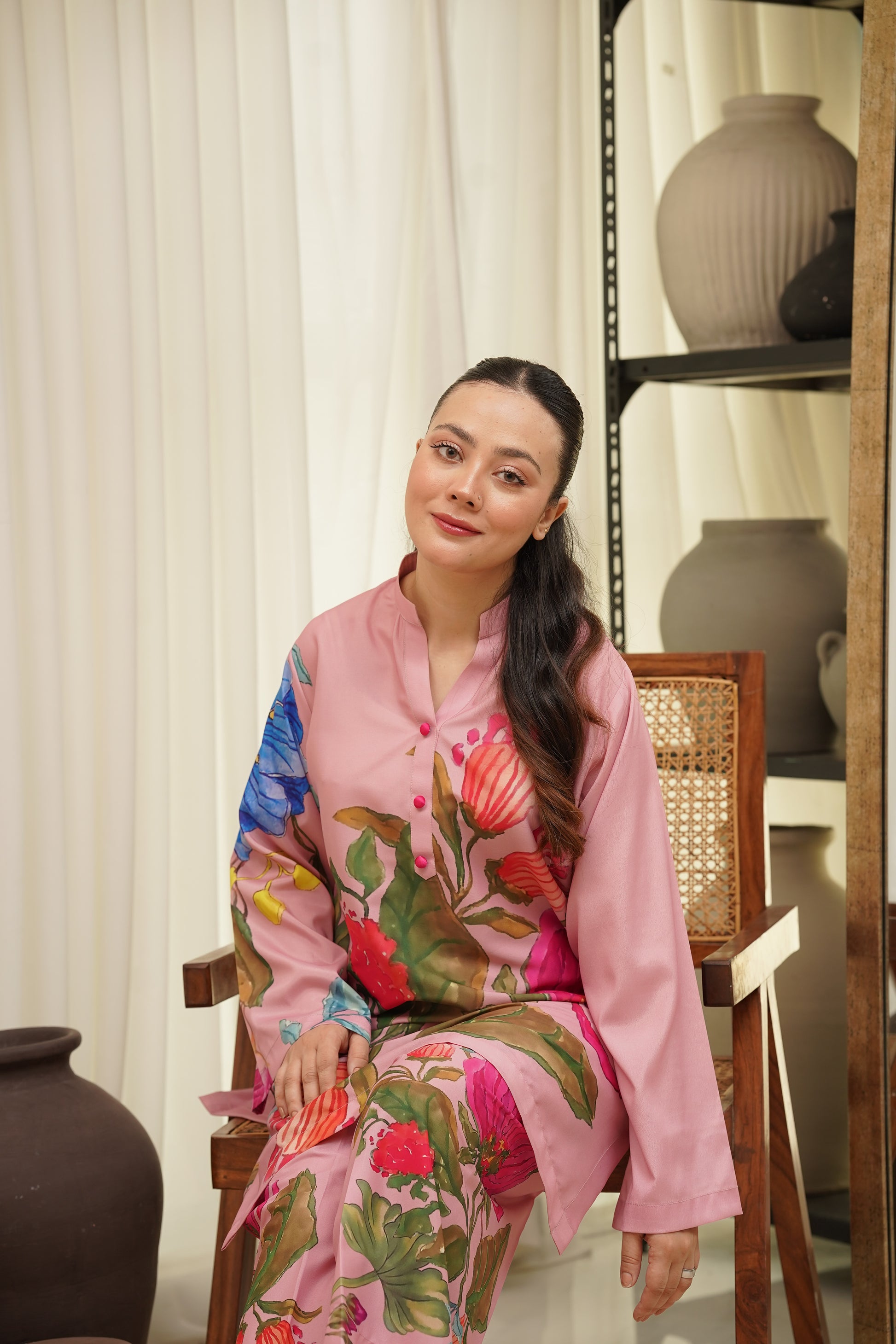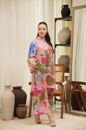Indulge in elegance with this pastel-hued crepe ensemble, featuring an artistic floral print in vibrant tones for a refreshing look. The breathable fabric and relaxed fit make it perfect for effortless sophistication and all-day comfort.