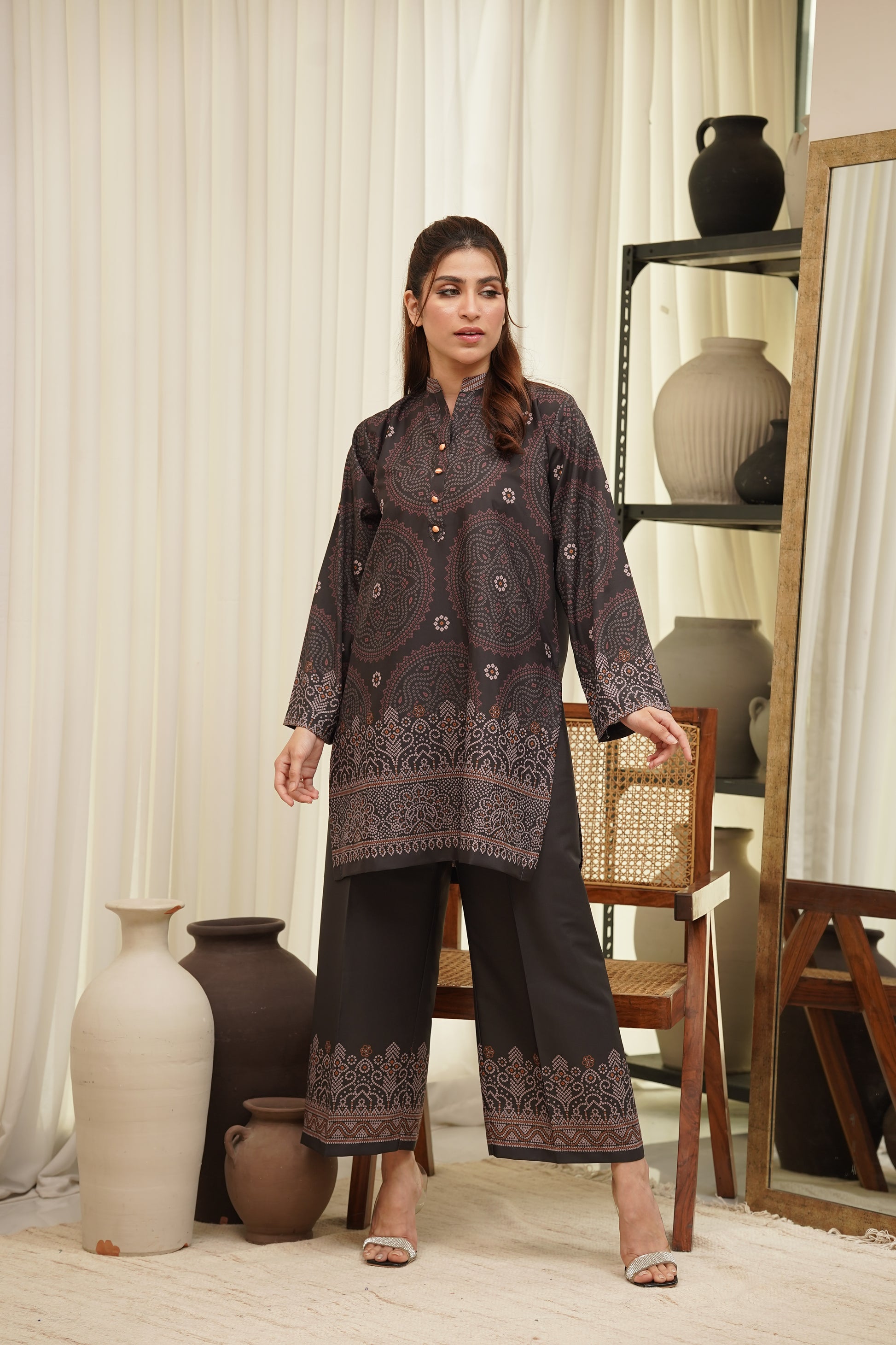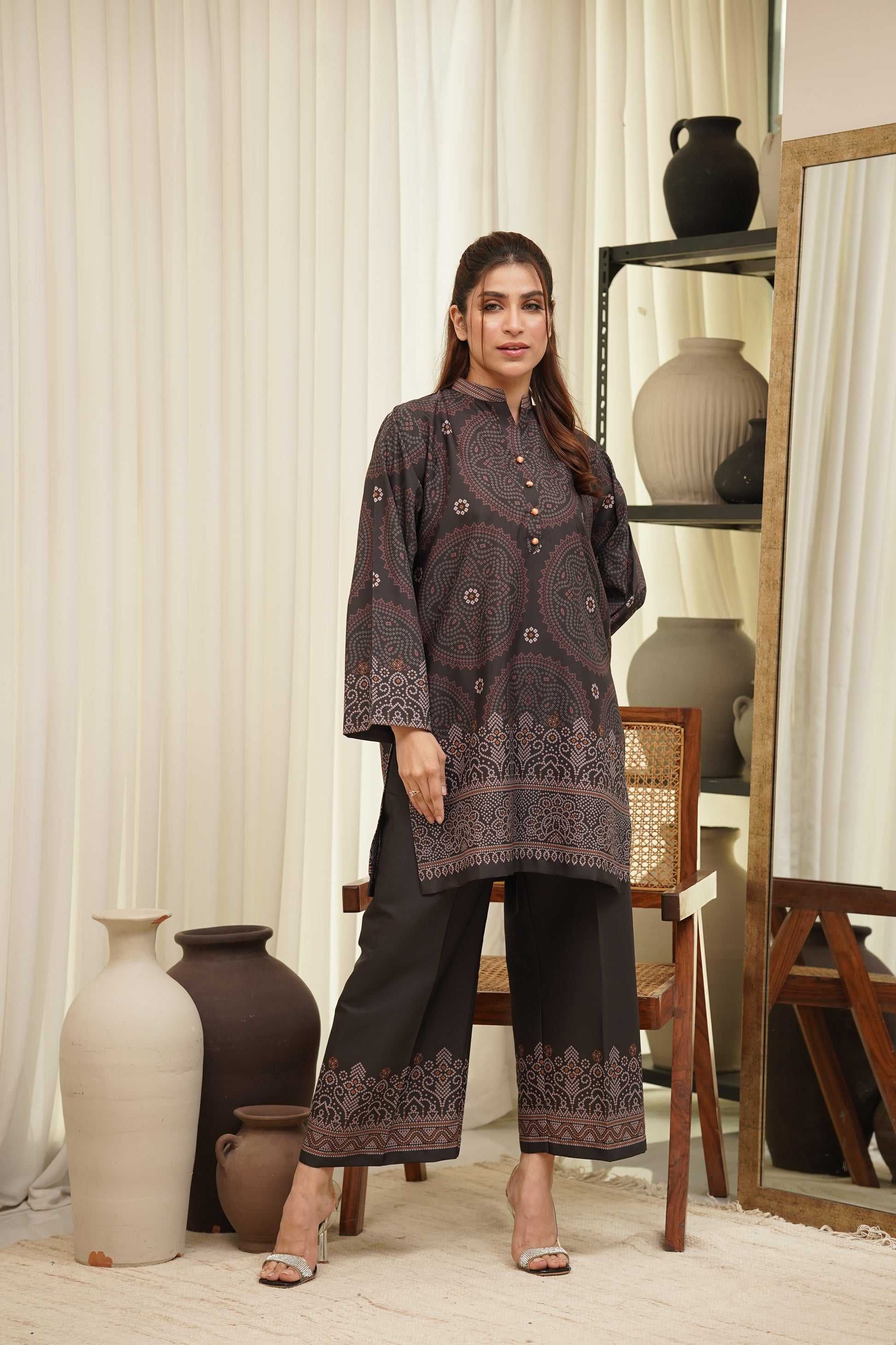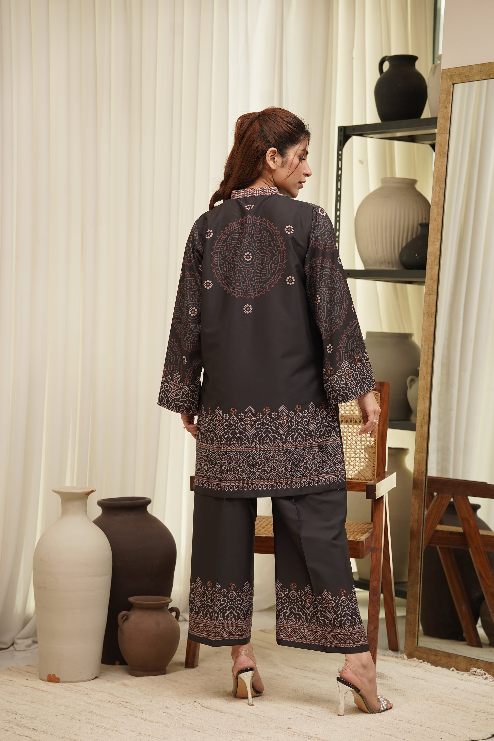A black crepe two-piece adorned with intricate geometric patterns and elegant button detailing. Effortlessly stylish and breathable, perfect for a bold yet graceful look.