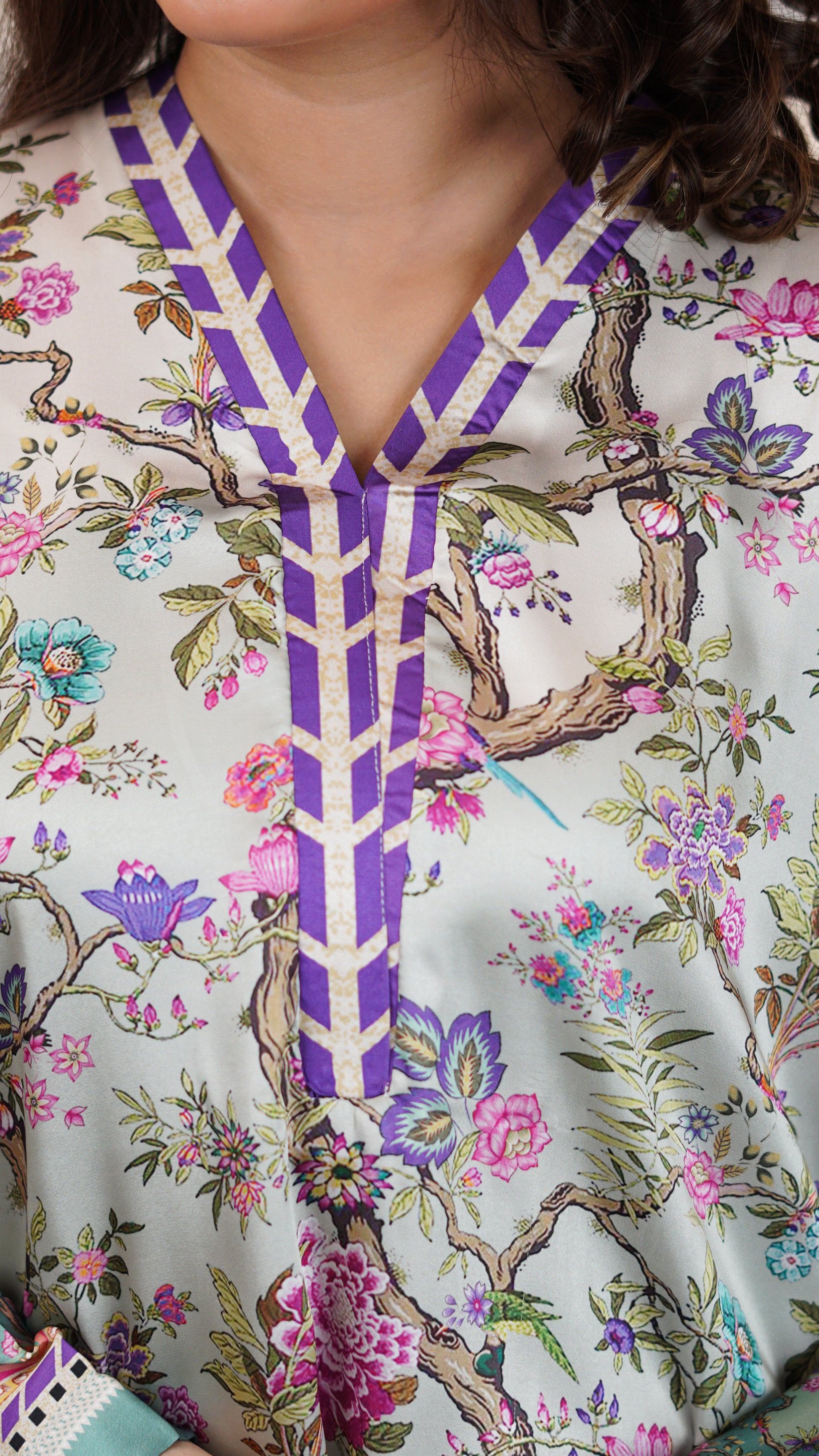 The straight-cut shirt is enhanced with subtle neckline detailing and printed borders