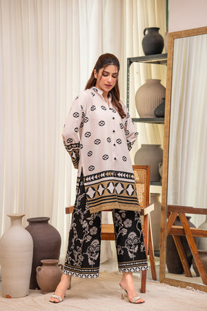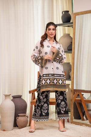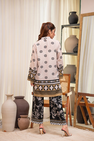 This refined 2-piece crepe set features a white button-down shirt with geometric motifs and mustard accents. Paired with black trousers adorned with floral and paisley patterns, it’s perfect for chic gatherings